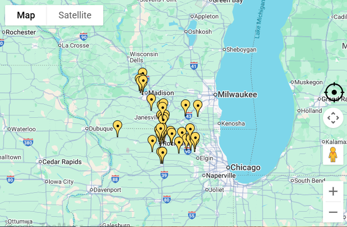 Waunakee, Middleton, Madison, Evansville, Janesville, Elkhorn, Burlington, Beloit, South Beloit, Rockton, Stockton, Rockford, Byron, ROCHELLE, Belvidere, Genoa, Marengo, Woodstock, Huntley, Hampshire, Algonquin, and Carpentersville